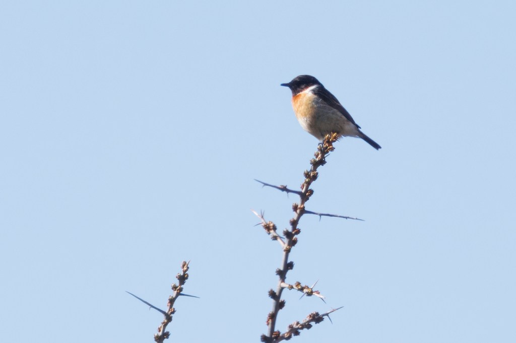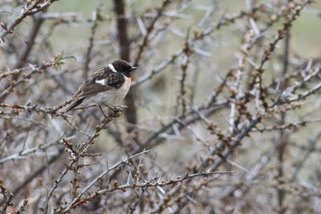 Below is a quite clearly identifiable male European Stonechat with a somewhat concentrated orange pattern on the chest. This could suggest an Asian Stonechat, but it is not actually contrasting enough for that. Additionally, there is also flank streaking present, the white does not extend far enough into the neck, and there is hardly any white patterning present in the wing.